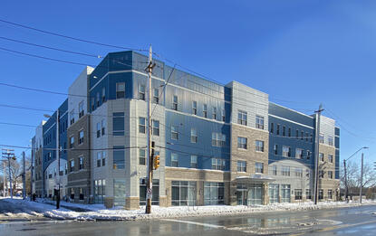 Harper’s Pointe is a new 71 unit permanent supportive housing building located in Cleveland’s Brooklyn Centre Historic District. The building features amenities that include a community room, a courtyard, bicycle storage, and a counseling suite.